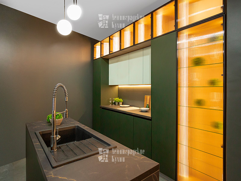 Функциональное освещение рабочей зоны реализуется с помощью встроенных светодиодных лент или точечных светильников. Декоративная подсветка нижней части модуля создает эффект «парения». Дополнительное освещение внутри шкафов помогает легко находить нужные предметы и создает интересные световые акценты при использовании стеклянных фасадов и открытых полок.