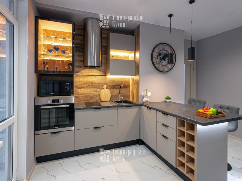 Если нужно использовать свободное пространство по максимуму, обратите внимание на Г-образный остров. В нем задействован угол. Такой модуль удобен и тем, что разделяет зоны готовки и сервировки.