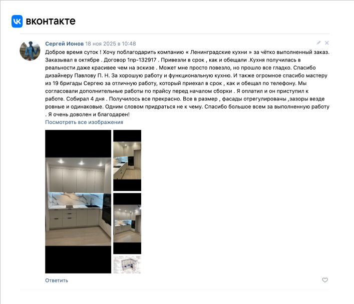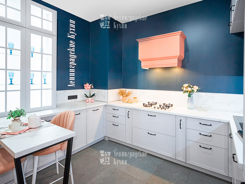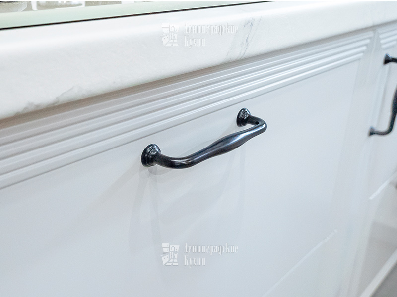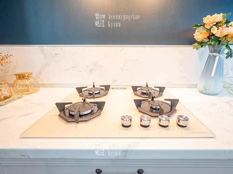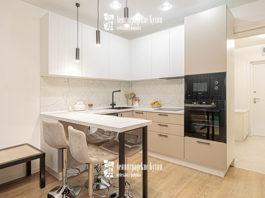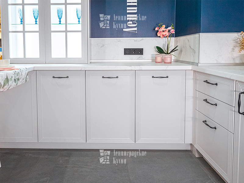 Черные ручки-скобы придают элегантность и изысканность, а встроенная техника делает его функциональным и удобным в использовании. Столешница и фартук «под мрамор» придают кухне особый шарм, подчеркивая ее изысканность и стиль.
