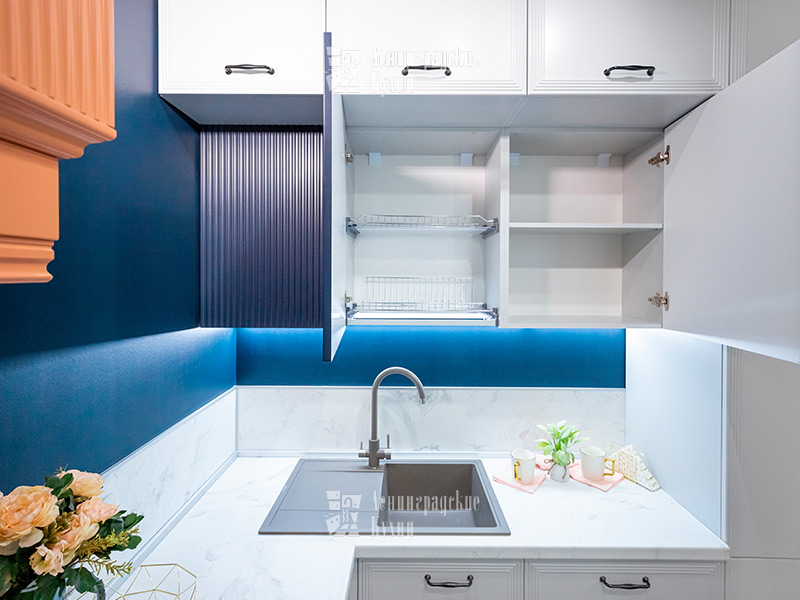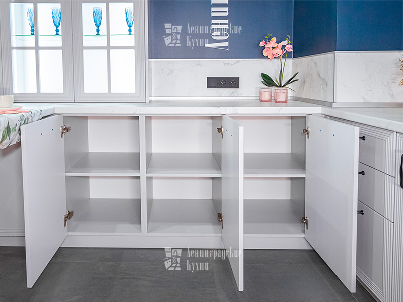 Кухонный гарнитур «Френсис» — это настоящее произведение искусства. Выполненный в стиле «прованс», он сочетает в себе легкость и воздушность, благодаря сочетанию белых с рифлёными синими фасадами.