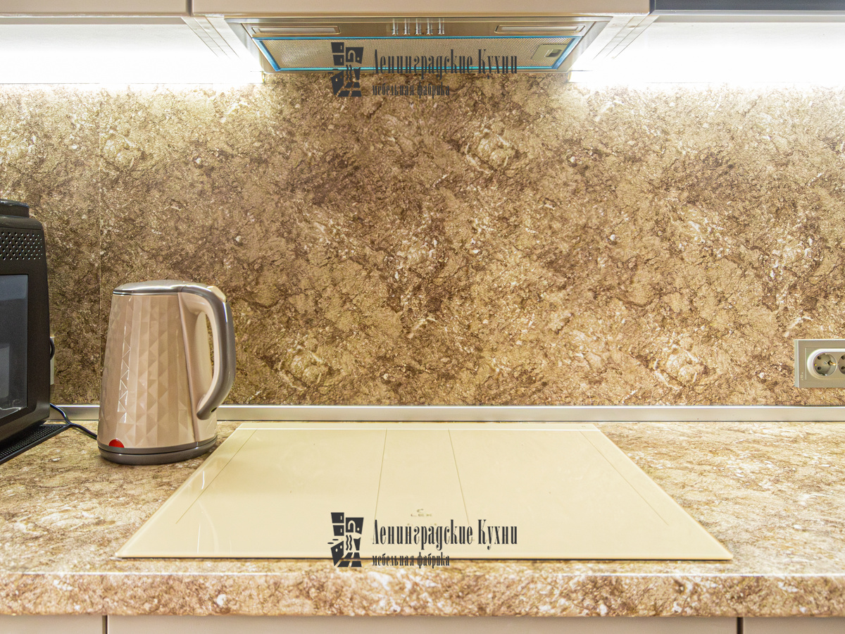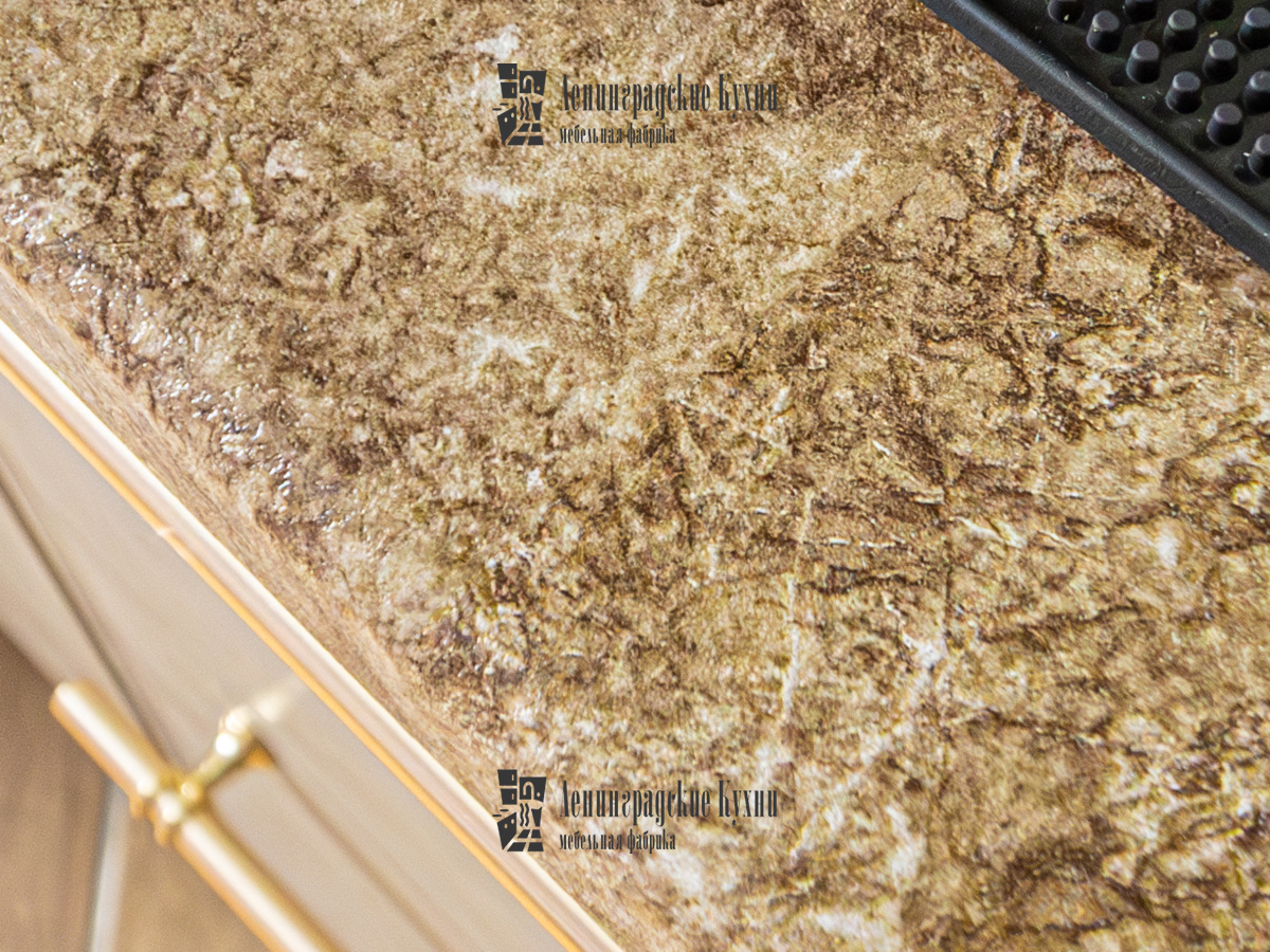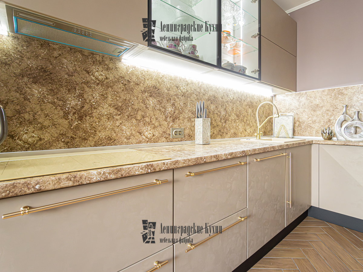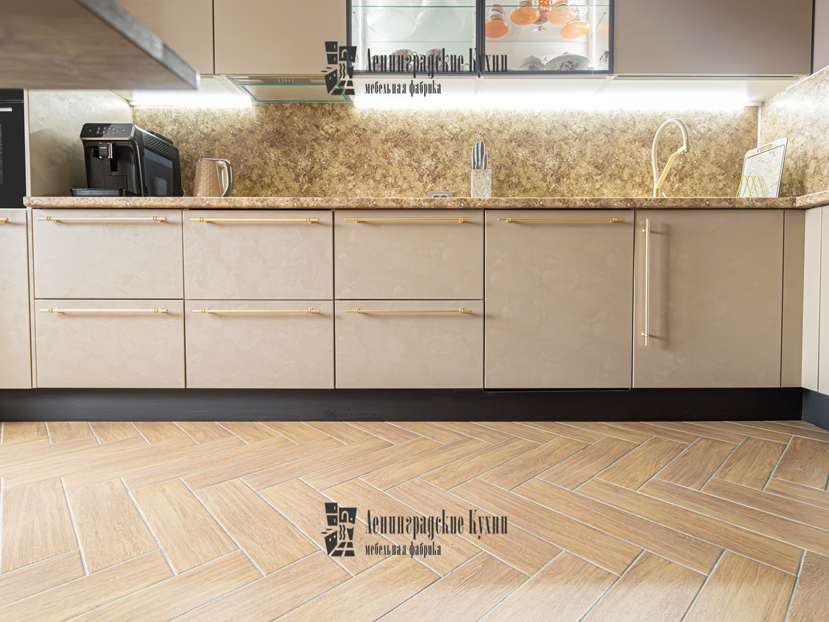 Столешница и фартук «Мадрид» с выразительным рисунком добавляют средиземноморский акцент, контрастируя со строгостью фасадов. Алюминиевый плинтус и графитовые стёкла вносят современные ноты, завершая образ. Идеально для тех, кто ценит спокойную роскошь, натуральные текстуры и лаконичность.