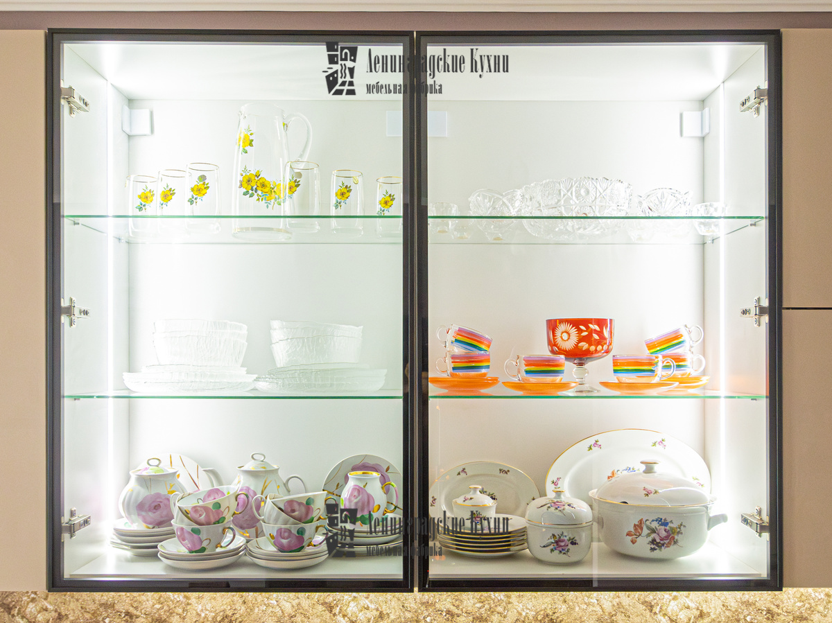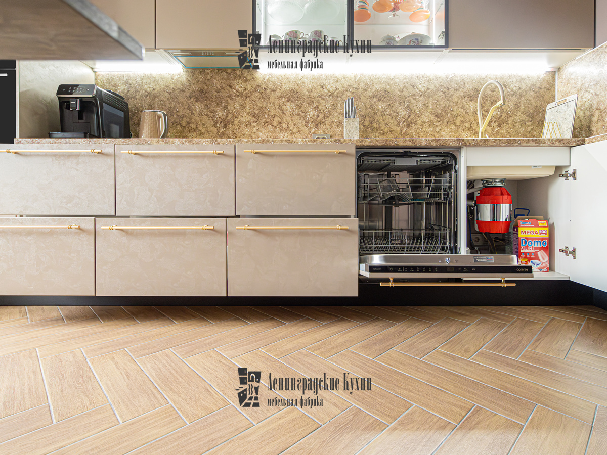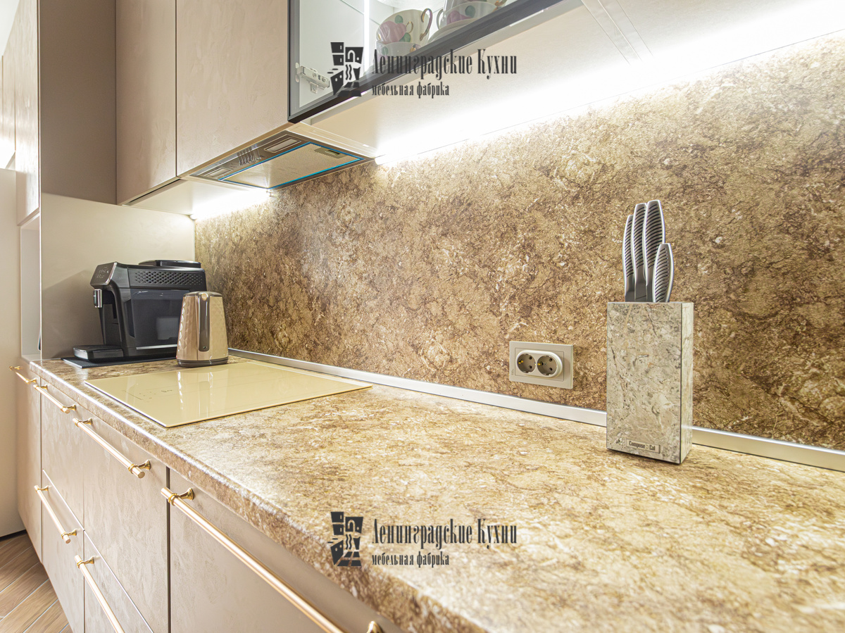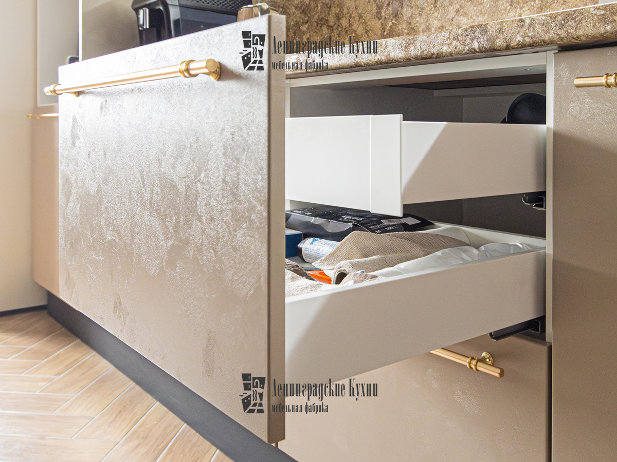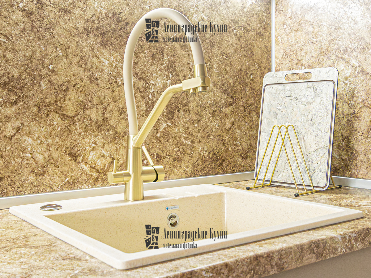 Столешница и фартук «Мадрид» с выразительным рисунком добавляют средиземноморский акцент, контрастируя со строгостью фасадов. Алюминиевый плинтус и графитовые стёкла вносят современные ноты, завершая образ. Идеально для тех, кто ценит спокойную роскошь, натуральные текстуры и лаконичность.