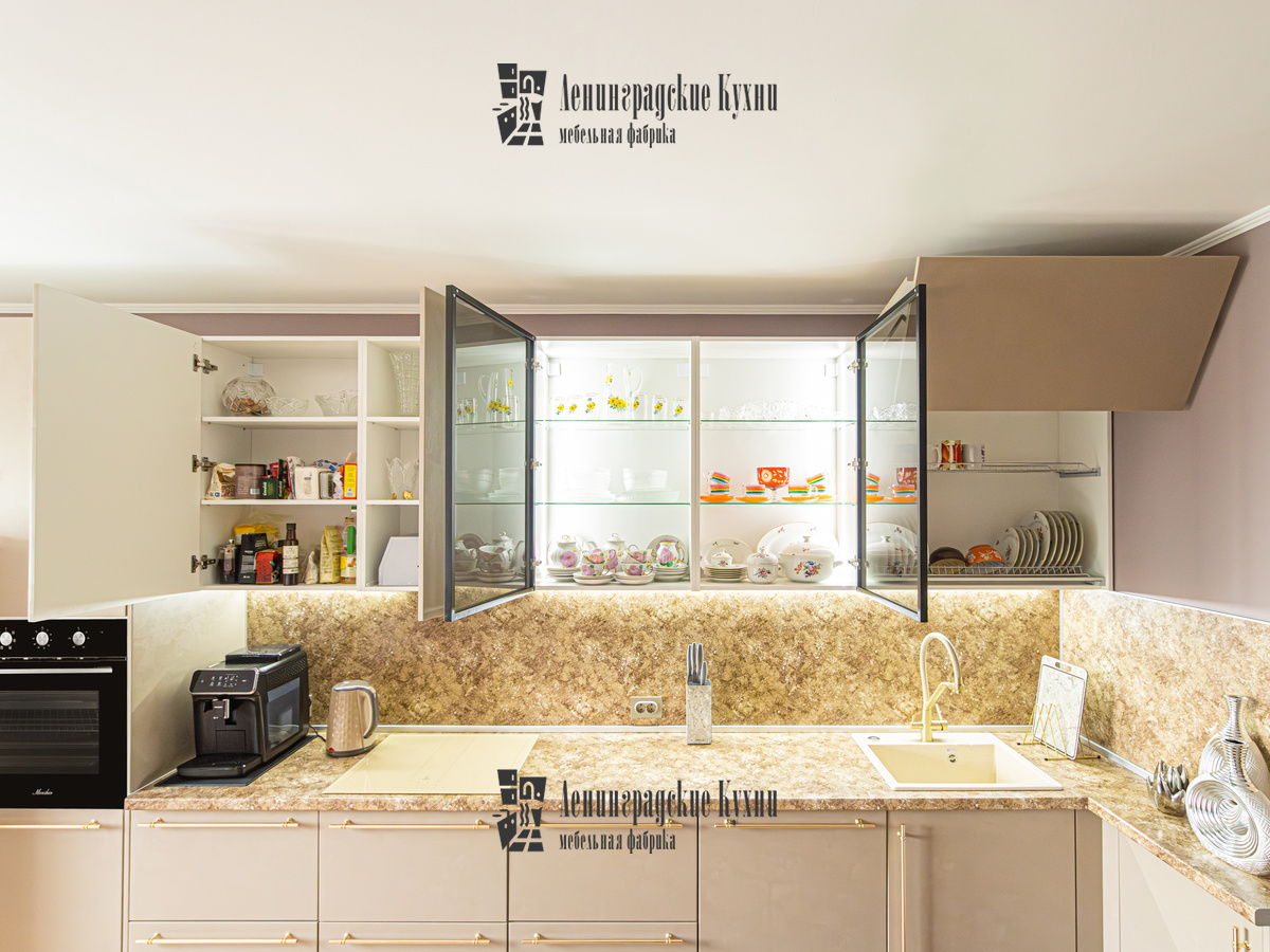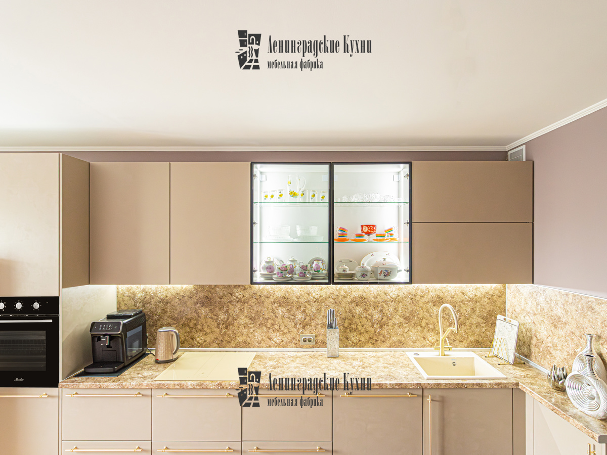 Гарнитур «Лана» — это сдержанная элегантность и глубина. Фасады цвета мокко с текстурой сланца создают благородную матовую поверхность, напоминающую о дорогом камне. Белый корпус мягко подсвечивает тёплый оттенок, добавляя пространству лёгкости и простора.