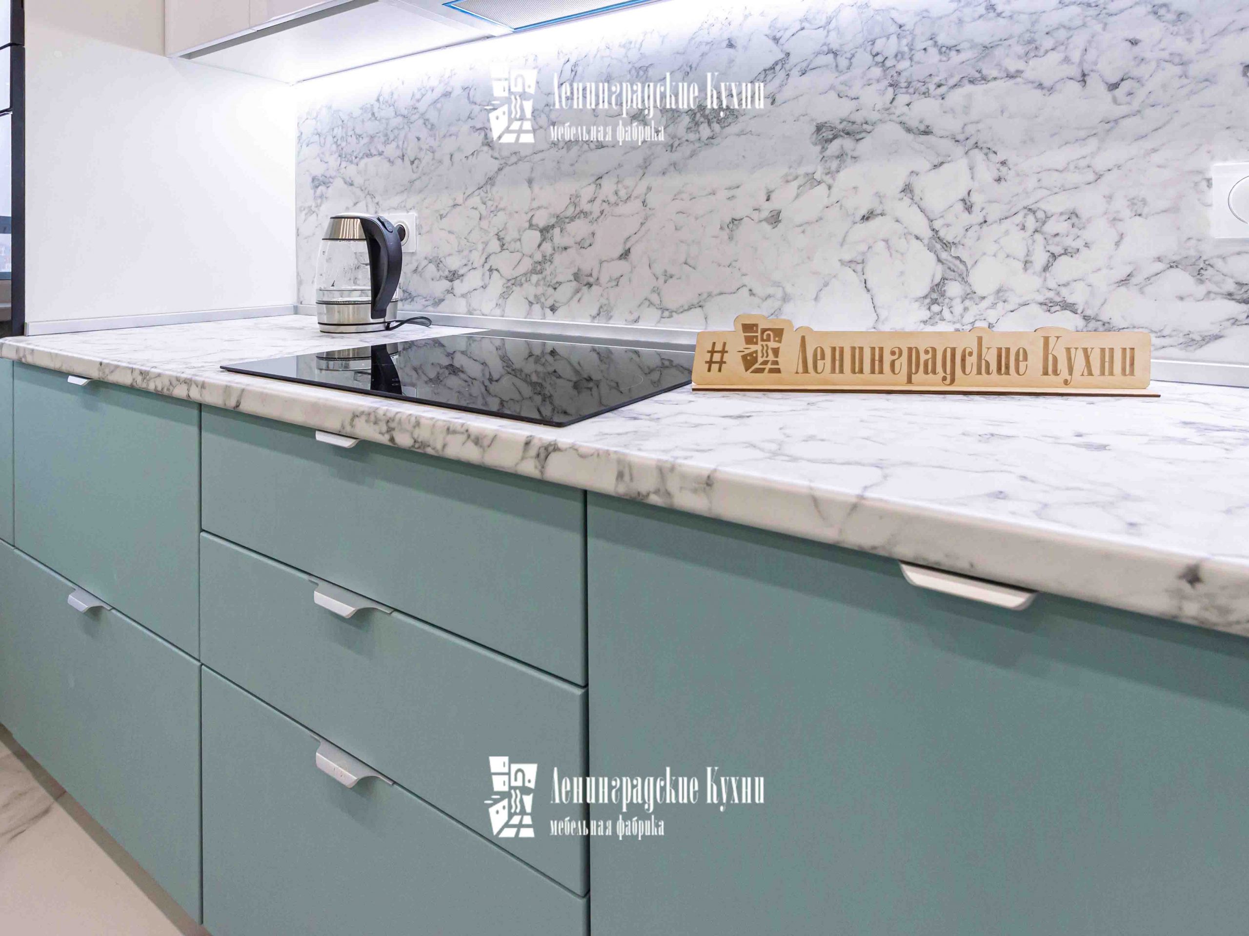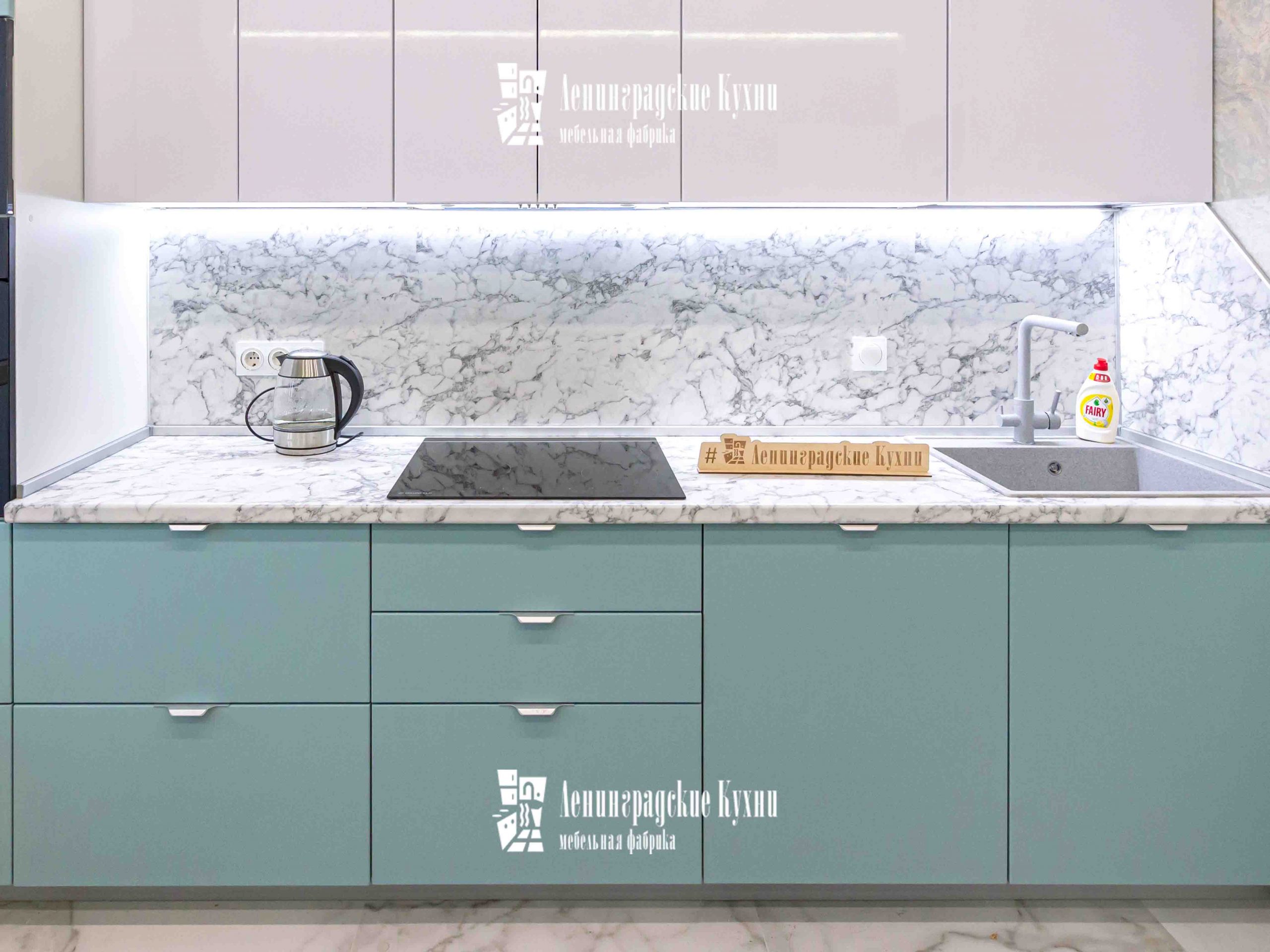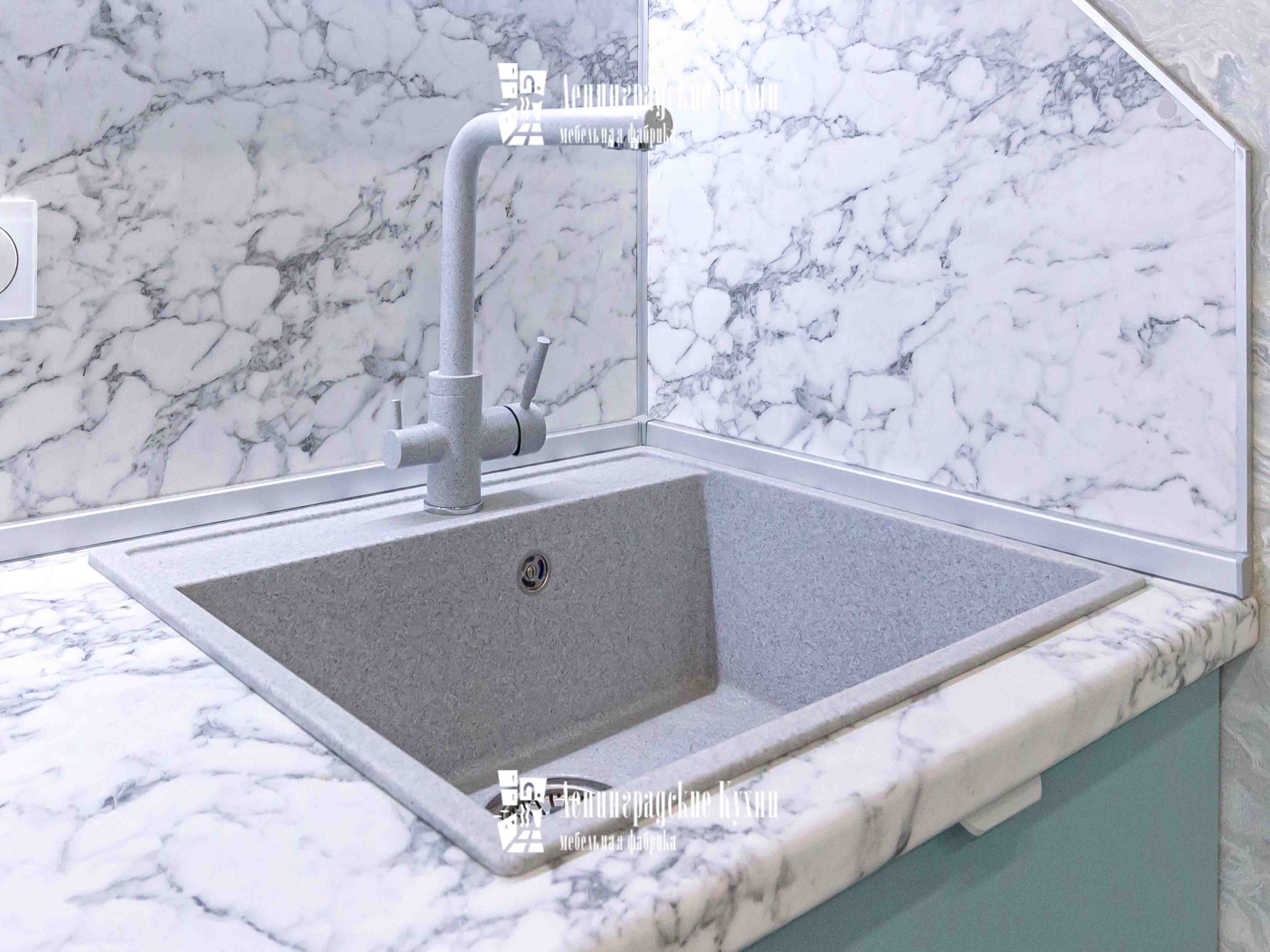 Сдержанный стиль и элегантность данной модели прекрасно сочетаются со встроенной техникой, создавая ощущение комфорта и функциональности. Столешница и фартук, выполненные «под мрамор», добавляют в интерьер нотки роскоши и благородства.
