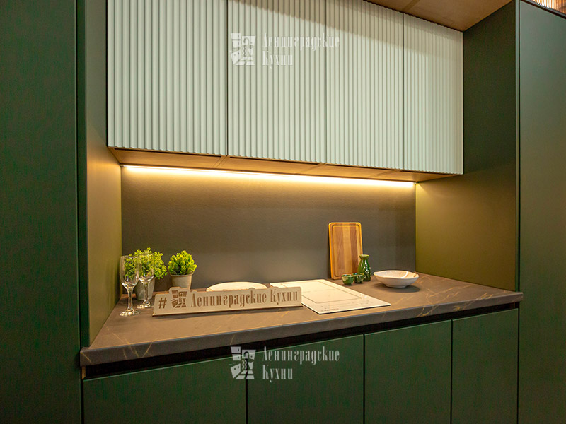 Кухонный гарнитур «Тропикана» — это настоящее воплощение тропической атмосферы в вашей кухне! Он выполнен в сочетании белых, темно-зелёных и стеклянных фасадов, деревянного каркаса и черной столешницы «под мрамор».