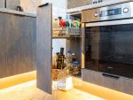 Столешница и фартук «Небула» с мерцающими прожилками усиливают космическую тему, словно млечный путь на тёмной поверхности. Чёрные ручки «Монте» оттеняют переливы, завершая целостный образ. Для тех, кто ищет гармонию лёгкости и глубины — где дневной свет встречается с магией ночи.