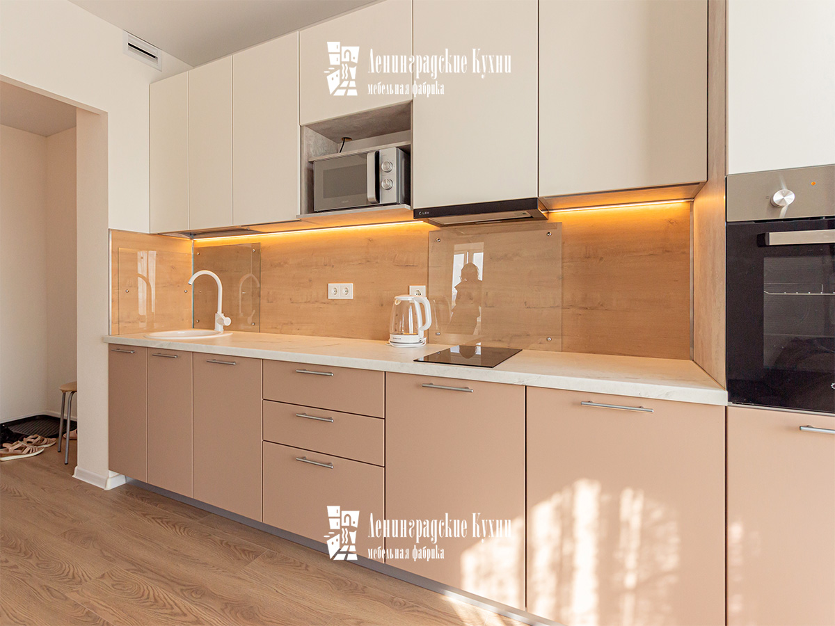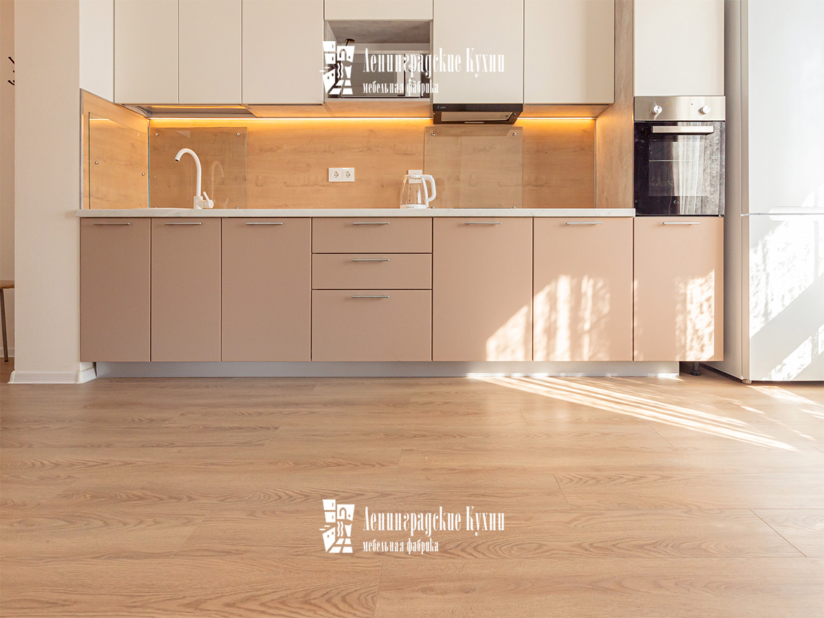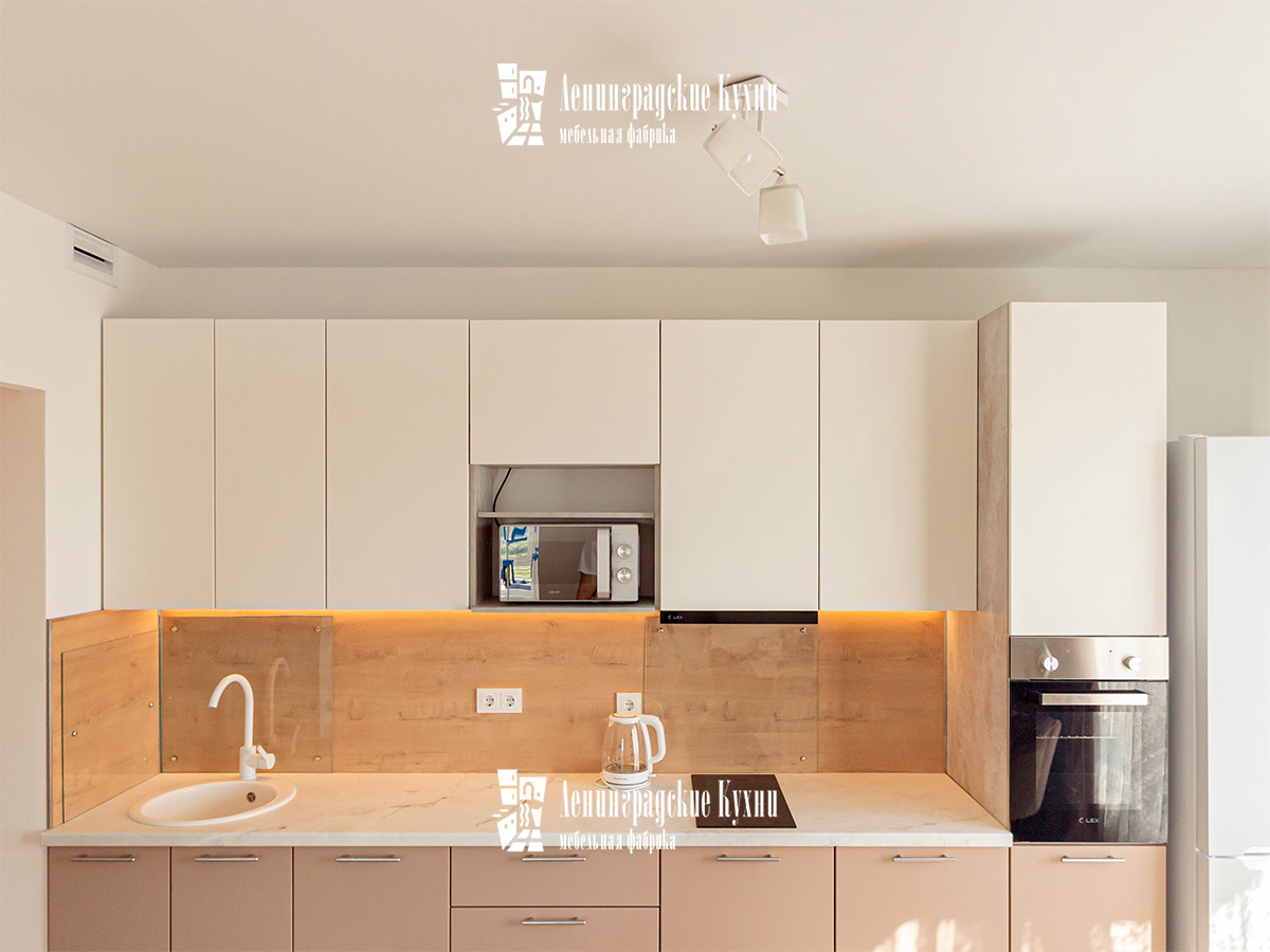 Кухонный гарнитур «Злата» — это гармония утончённой элегантности и минимализма. Нежные бежевые и песочные оттенки шкафов создают атмосферу тепла и уюта, а строгие линии и гладкие фасады добавляют современности. Верхние шкафы в светлом тоне визуально расширяют пространство, а встроенная техника и подсветка над рабочей зоной подчёркивают функциональность и стиль. Этот гарнитур идеально впишется в любой интерьер, где хочется сочетать комфорт с эстетикой. «Злата» — кухня, где каждое утро начинается с вдохновения!