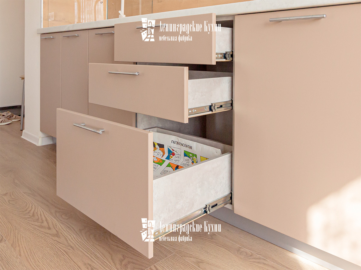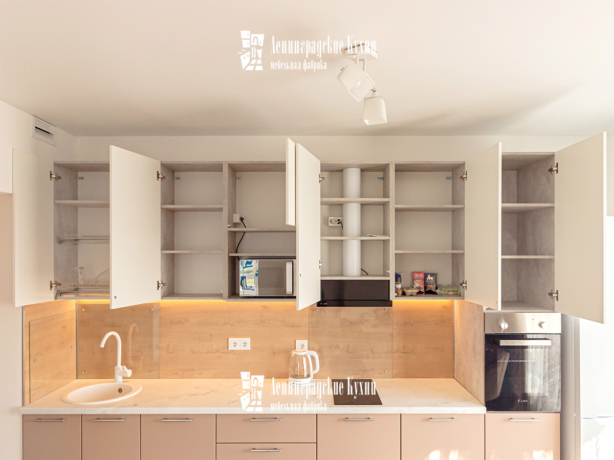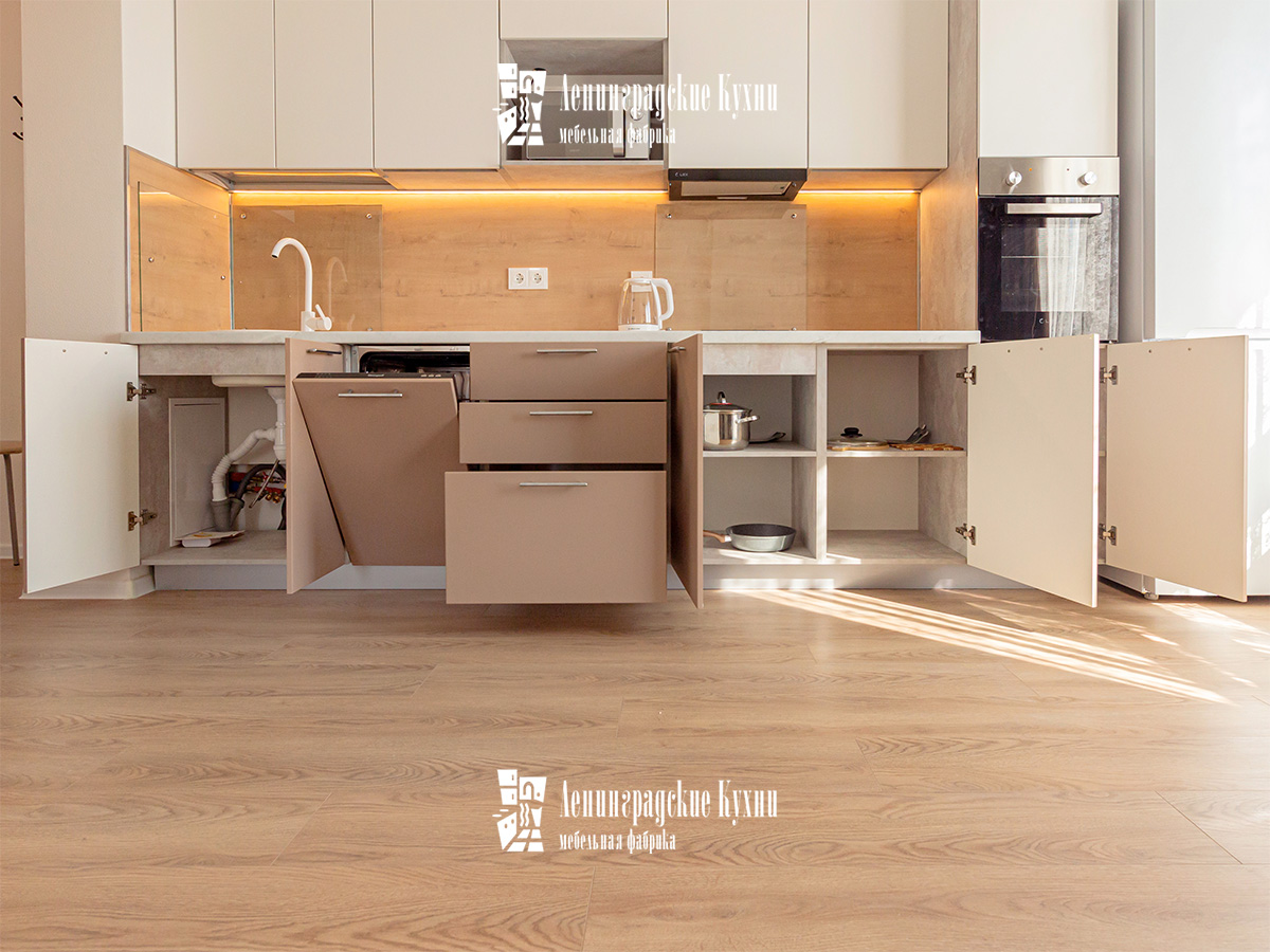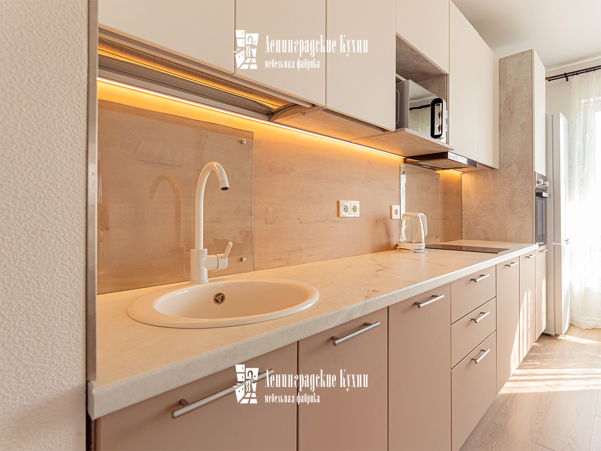 Кухонный гарнитур «Злата» — это гармония утончённой элегантности и минимализма. Нежные бежевые и песочные оттенки шкафов создают атмосферу тепла и уюта, а строгие линии и гладкие фасады добавляют современности. Верхние шкафы в светлом тоне визуально расширяют пространство, а встроенная техника и подсветка над рабочей зоной подчёркивают функциональность и стиль. Этот гарнитур идеально впишется в любой интерьер, где хочется сочетать комфорт с эстетикой. «Злата» — кухня, где каждое утро начинается с вдохновения!